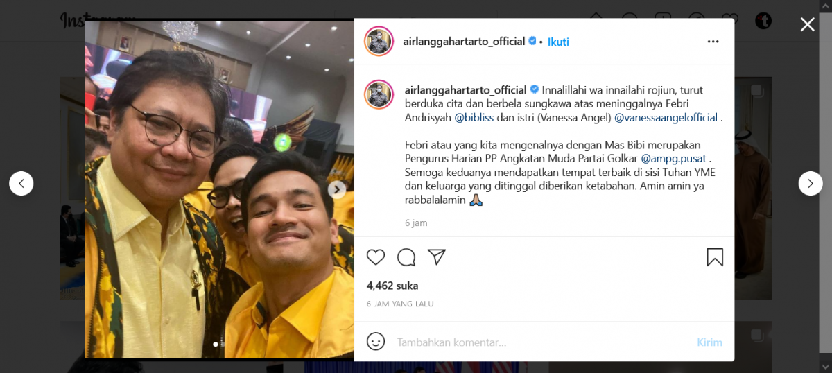 “Innalillahi wa innailaihi rojiun, turut berduka cita dan berbela sungkawa atas meninggalnya Febri Andrisyah dan istri (Vanessa Angel),” tulis Airlangga, dalam akun Instagram pribadinya @airlanggahartarto_official pada Kamis (04/11/2021) malam.