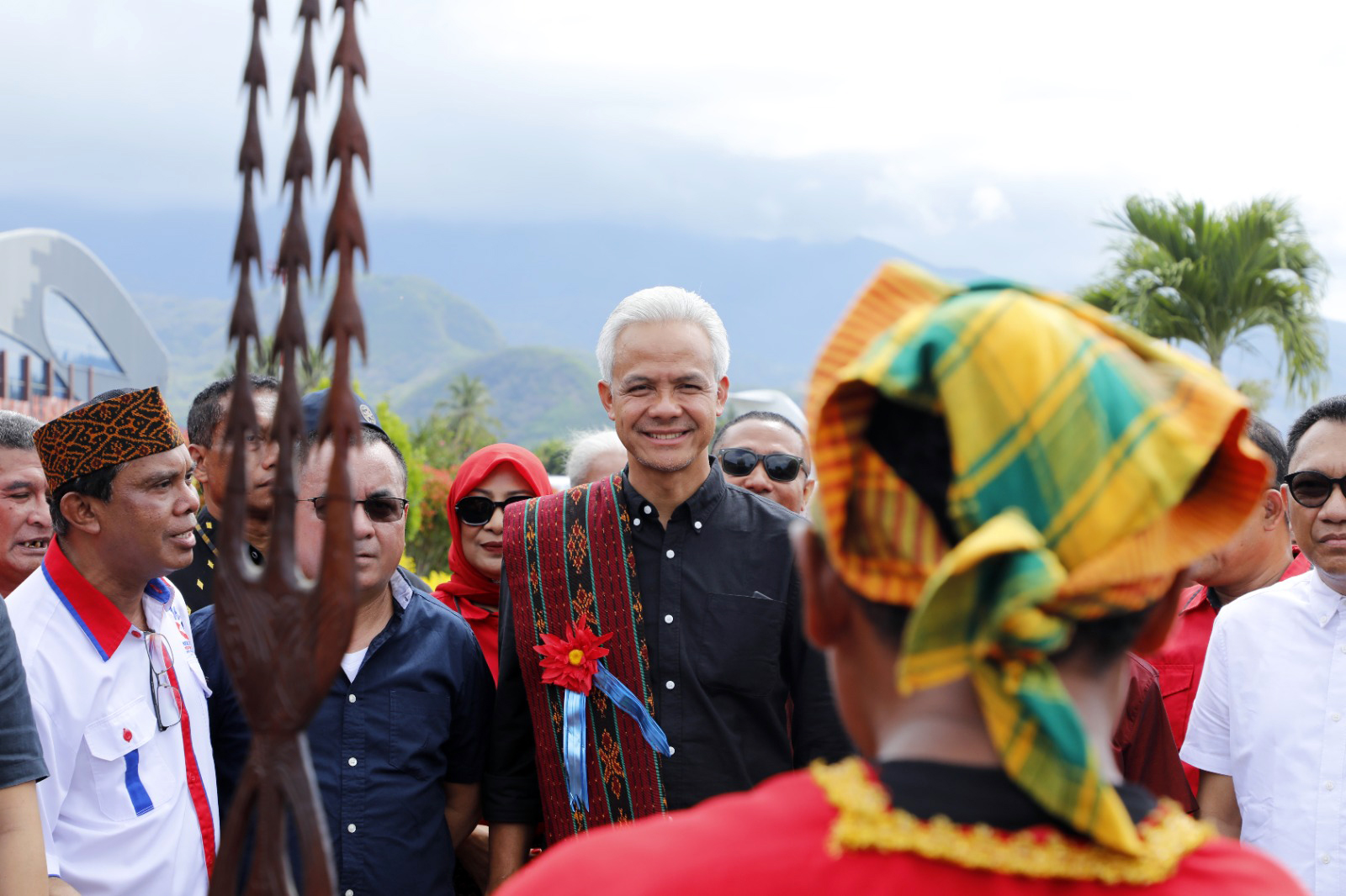 Telegraf – Calon presiden (capres) 2024 Ganjar Pranowo disambut antusias masyarakat Ende ketika menginjakkan kaki di Kota Pancasila, Sabtu (02/12/2023). Ganjar mendapat hadiah selendang tenun khas Ende oleh tokoh adat setempat dan suguhan Tari Woge untuk menyambut kedatangannya.