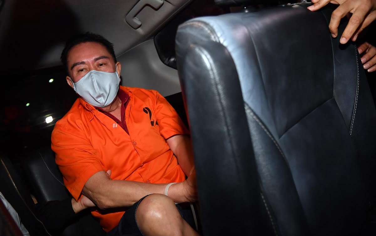 Photo Credit: Petugas kepolisian membawa buronan kasus korupsi pengalihan hak tagih (cessie) Bank Bali Djoko Tjandra yang ditangkap di Malaysia menuju Bareskrim Polri setibanya di Bandara Halim Perdanakusuma. ANTARA/Nova Wahyudi