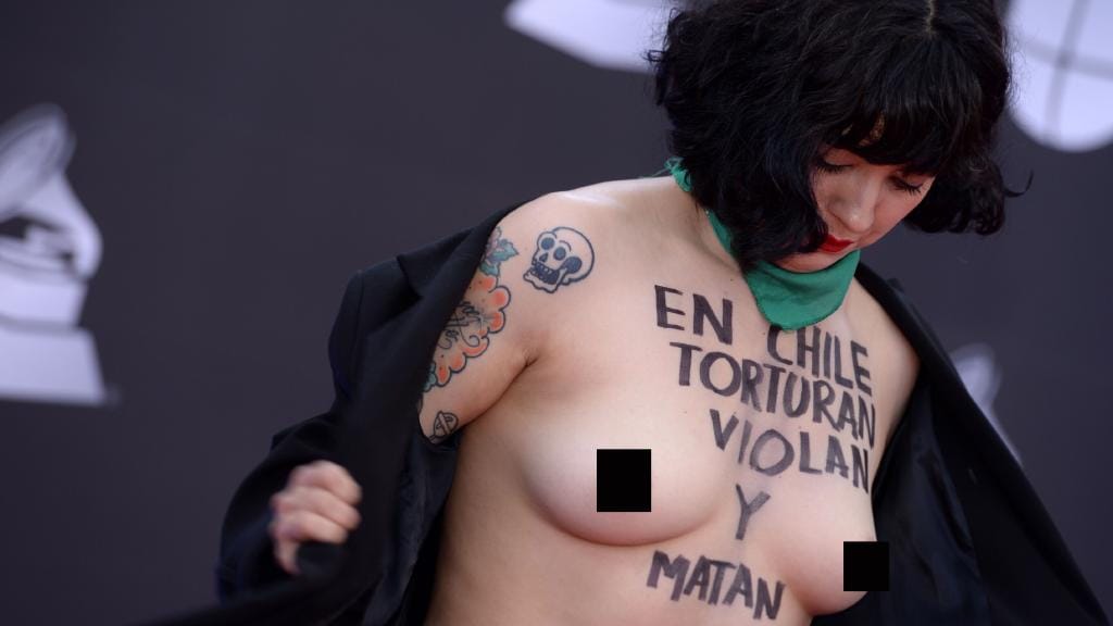 Telegraf, Chile - Seorang penyanyi Cile telanjang dada untuk protes terhadap apa yang terjadi di negaranya, di tengah unjuk rasa…