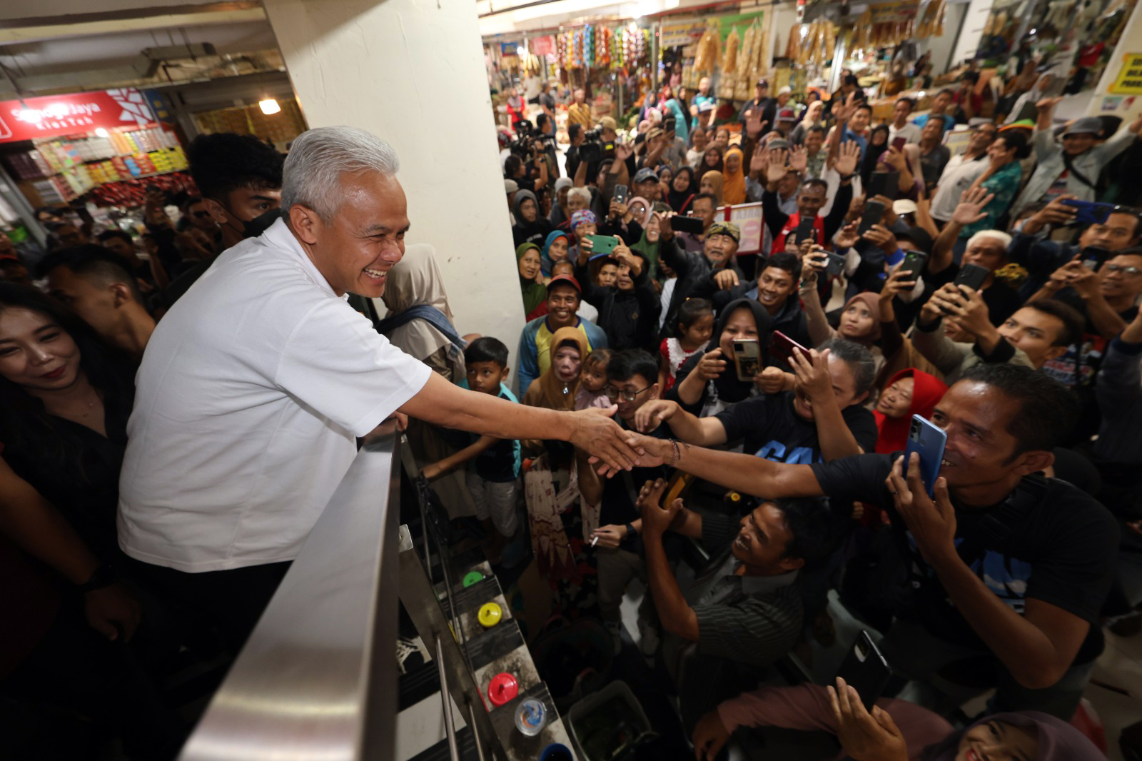 Telegraf - Nadia (25) tak henti-hentinya berteriak histeris memanggil nama Ganjar Pranowo yang dikerumuni ribuan orang di Pasar Proyek Lama…