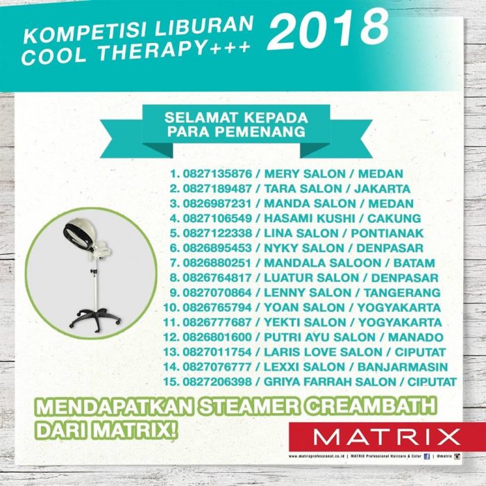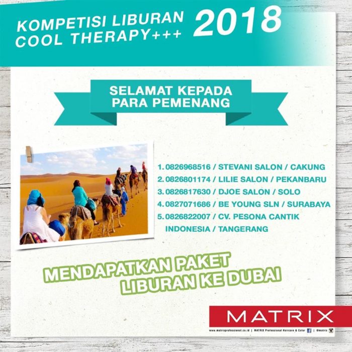 Telegraf, Jakarta – Matrix Indonesia merupakan sebuah brand yang pertama dan menghadirkan servis profesional untuk kulit kepala tertutup melalui service Cool Therapy+++. Dengan estimasi sebesar 42% dalam memberikan kontribusi positif sejak tahun 2017 bagi pertumbuhan bisnis Matrix Indonesia, maka Matrix Indonesia mengadakan sebuah kompetisi liburan Cool Therapy+++ sejak 1 Februari 2018 sebagai bentuk apresiasi serta dukungan kepada para mitra salonnya diseluruh Indonesia.