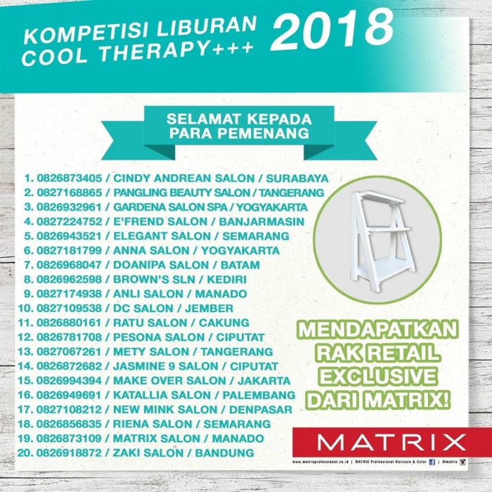 Berikut daftar untuk list salon lengkapnya siapakah kira-kira pemenang hadiah menarik lainnya, informasi hasil undiannya akan dipublikasikan besok di #MatrixIndonesia. (Red)