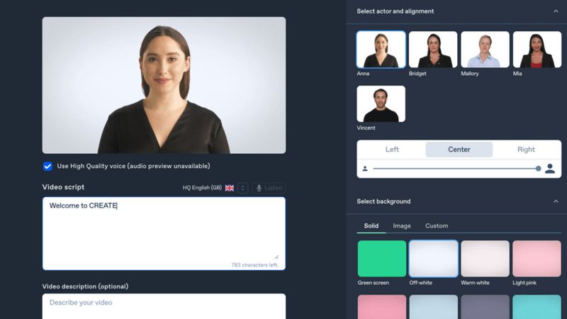 Untuk membuat video dengan AI menggunakan sistem Synthesia, anda cukup memilih satu dari sejumlah avatar, ketikkan kata-kata yang anda ingin mereka katakan, selesai.