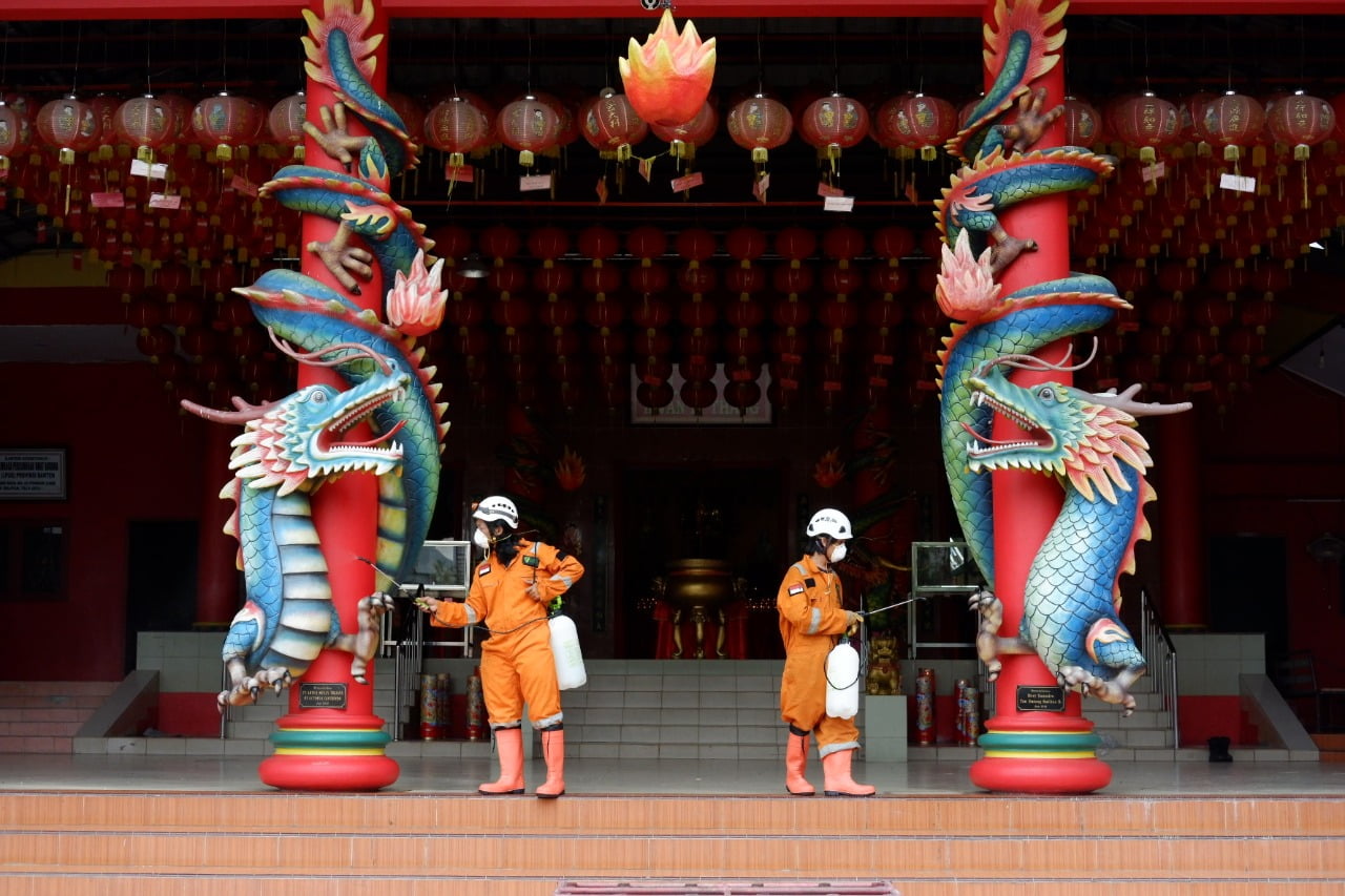 Photo Credit : Penyemprotan disinfektan pada saat pendemi, di salah satu Wihara di Jakarta/Istimewa
