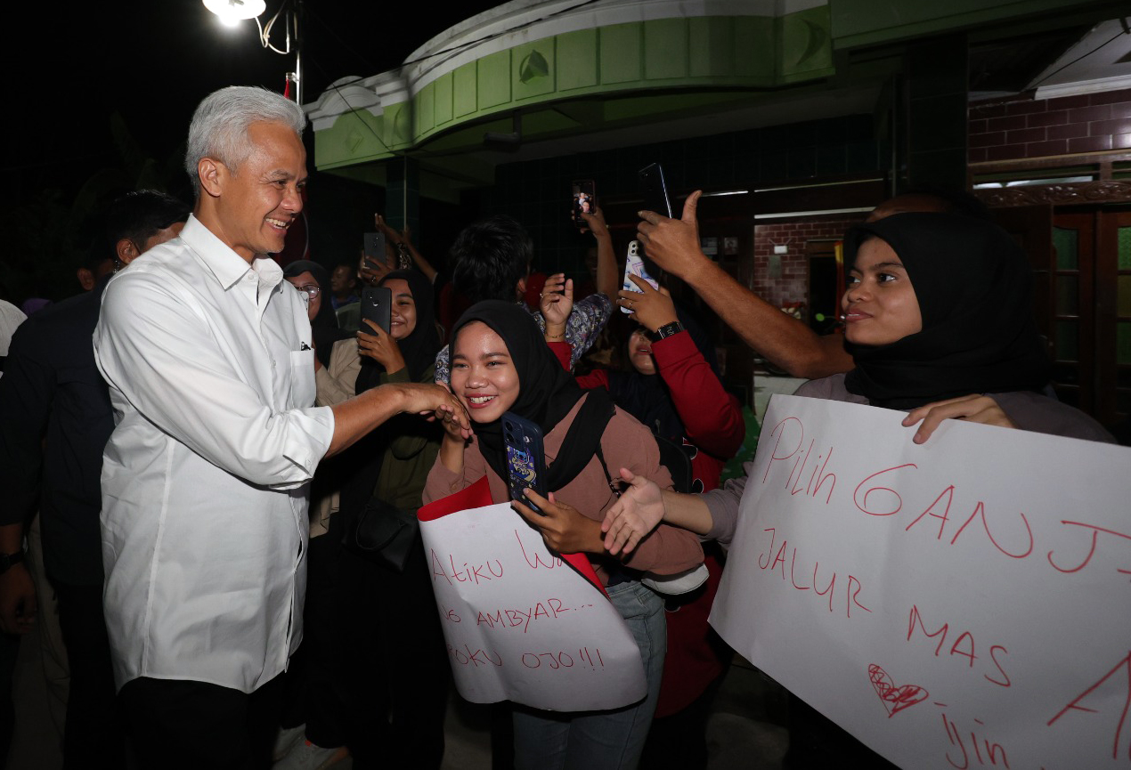 Ganjar yang berkegiatan di Solo Raya menyempatkan diri bertemu dengan anak muda Sragen di Bascamp Wiyas Krikilan Sragen, Minggu (24/12/2023) malam. Ratusan anak muda penerima KIP Kuliah itu langsung menyambutnya dengan gegap gempita.