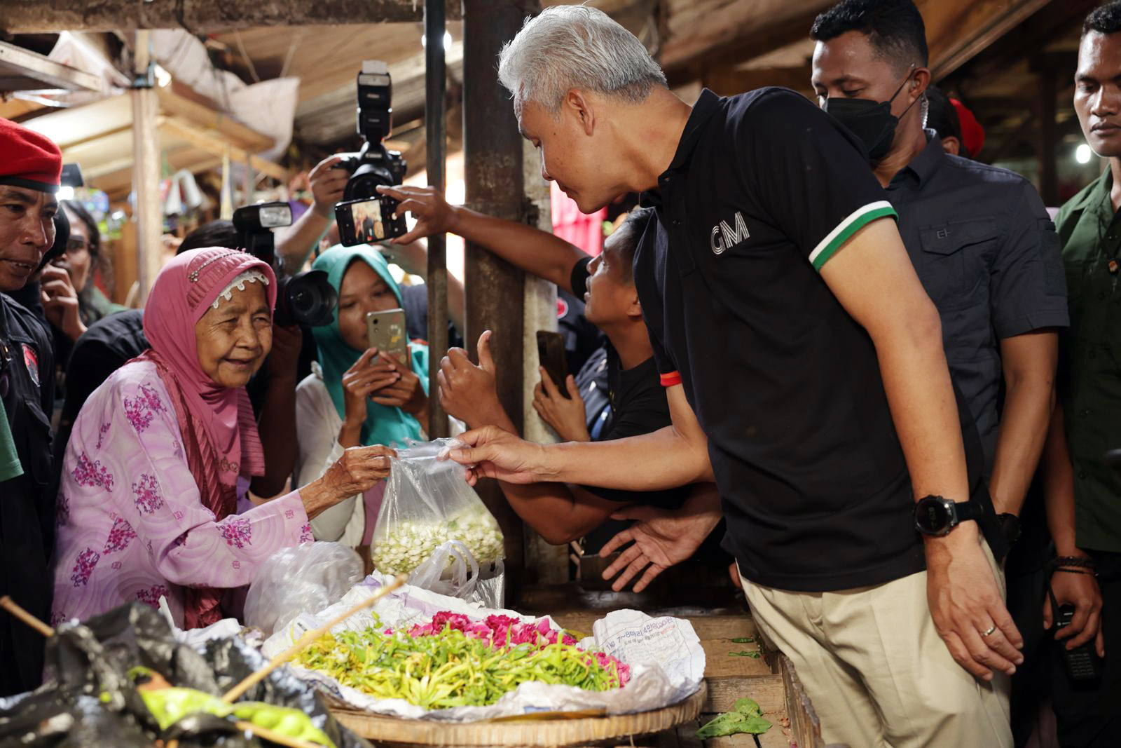 Mulanya, Ganjar tiba di pasar langsung menemui para pedagang untuk cek harga bahan pokok. Para pedagang dan warga justru heboh, meminta salaman dan berfoto bareng.