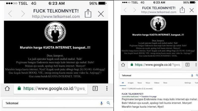 Peretas membuat situs www.telkomsel.com tak bisa diakses. Pengunjung disuguhi layar hitam yang berisi protes karena harga kuota Telkomsel yang mahal. Jika dilakukan pencarian Telkomsel di google, yang muncul menjadi Fuck Telkomnyet.