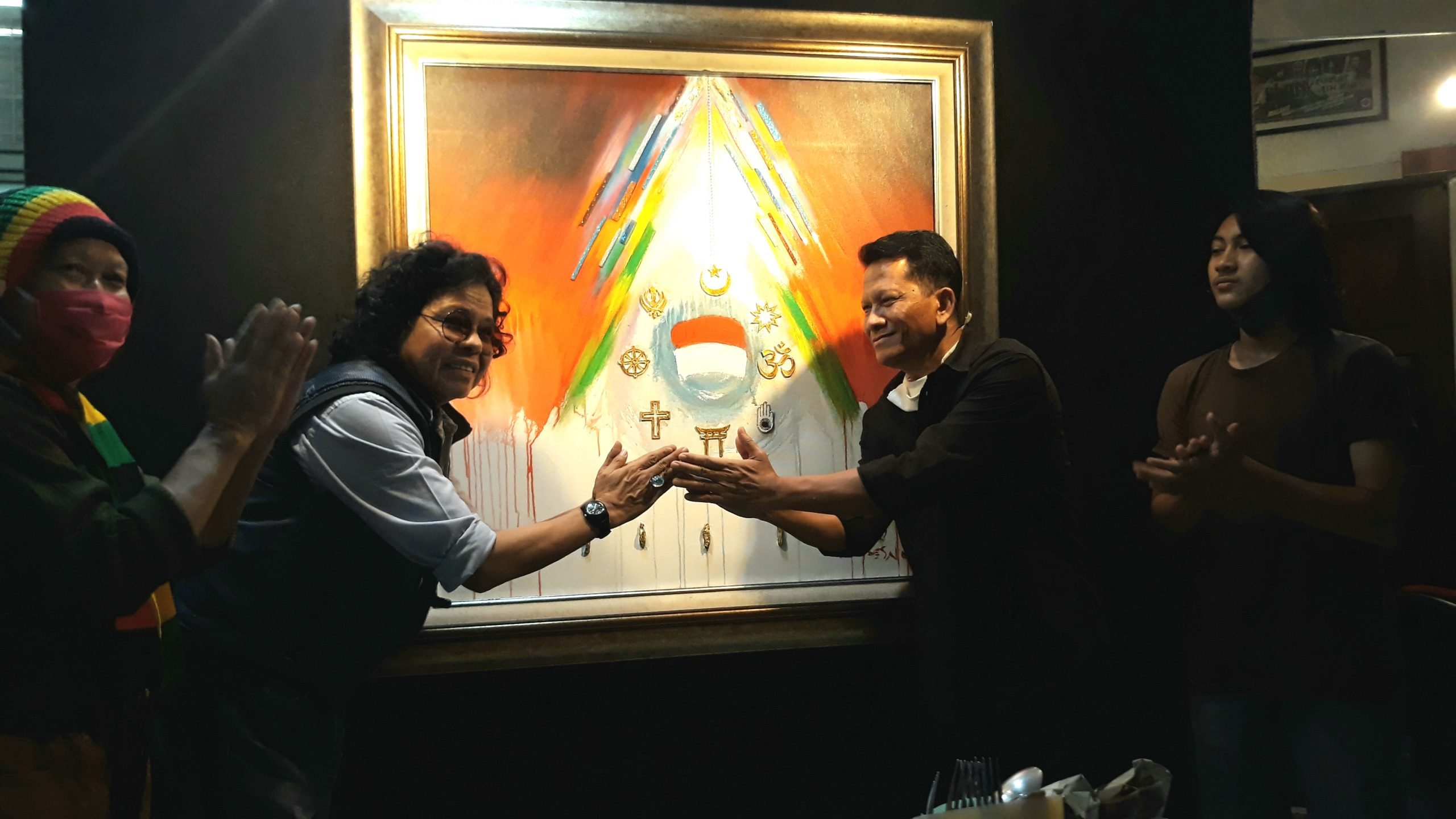 Credit Photo : Goes Noeg menyerahlan lukisan ke Ote Abadi, di Jakarta, Kamis (11/6)/telegraf
