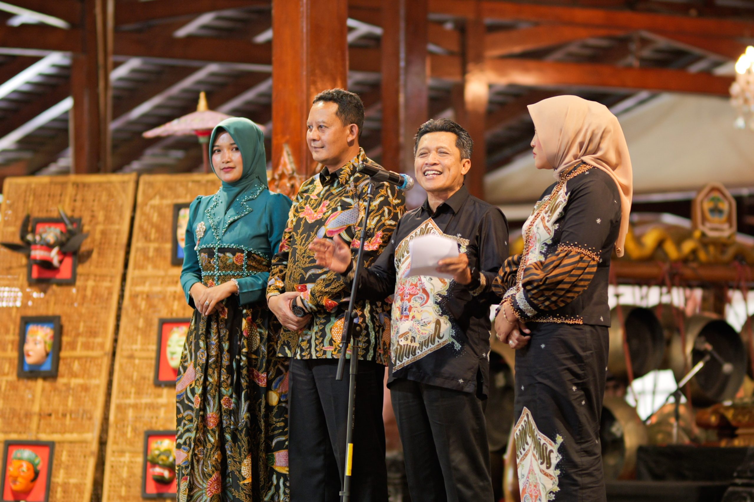 Bupati Wonosobo, Afif Nurhidayat (kedua kanan) saat membuka pentas duta seni Wonosobo di Anjungan Jawa Tengah, Taman Mini Indonesia Indah, Jakarta,(16/10/2025). Kehadiran pentas duta seni ini merupakan bukti bahwa seni tradisi terus berkembang tanpa kehilangan akar. “Wayang Bundeng Gepuk bukan hanya tontonan, tetapi juga tuntunan. Kolaborasi tari dan musik tradisional ini memperlihatkan identitas Wonosobo yang kreatif sekaligus berakar kuat pada budaya