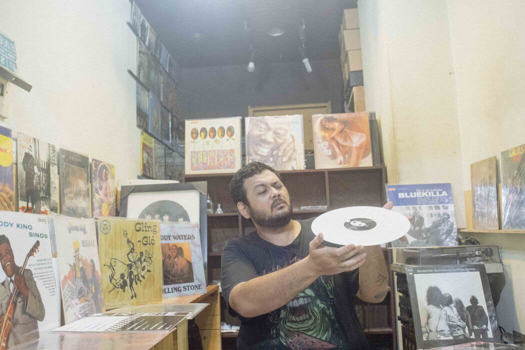 Owner Scratch Rhythm, Christ Allen Sembiring memerikasa koleksi piringan hitam di Tokonya, di Blok M Square, Jakarta. (Yuan Adriles untuk Telegraf.co.id)