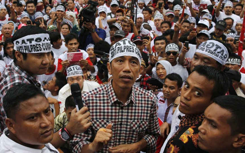 Calon presiden Indonesia Joko “Jokowi” Widodo (C) berbicara dengan para pendukungnya selama kampanye di Jakarta pada 26 Juni 2014. REUTERS/Beawiharta