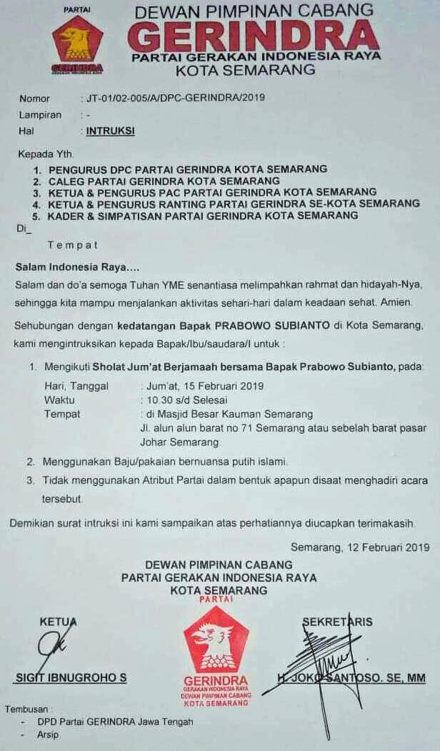 Pernyataan itu disampaikan kepada pengurus Partai Gerindra Jawa Tengah yang menemuinya. Namun demikian tiba-tiba ada yang memberikan informasi bahwa ada selebaran undangan untuk sholat Jum’at bersama Prabowo di masjid tersebut.