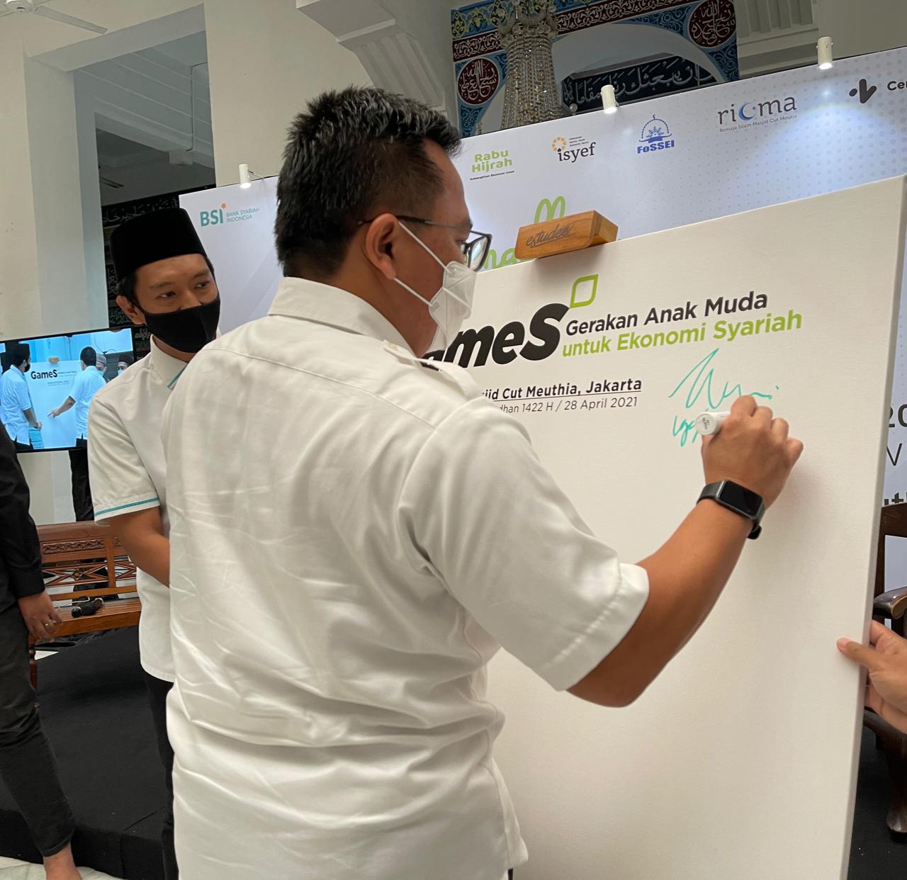 Photo Credit : Iggi H. Achsien, Sekretaris Jenderal Pengurus Pusat Masyarakat Ekonomi Syariah (PP MES) membubuhkan tandatangan bertanda mensuport GAMES/Doc/Ist