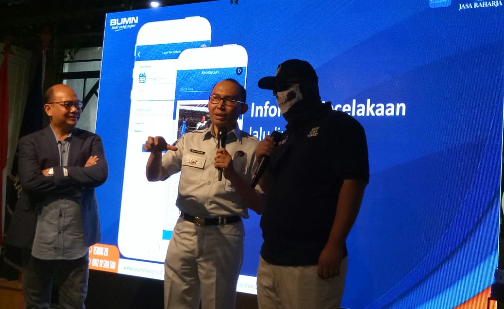 Photo Credit : Wahyu Wibowo Direktur Managemen Resiko dan Teknologi, PT. Jasa Raharja, (tengah) di damping Wahyu Muryadi (ki) Komisaris Independen dan Om Mobi youtuber (ka) dalam konfrensi pers di Jakarta, Rabu (13/11). TELEGRAF