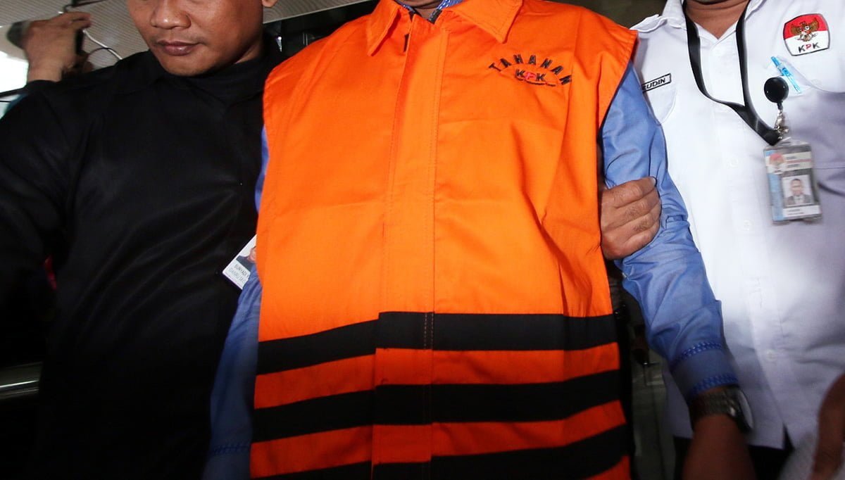 Photo Credit : Tersangka koruptor menggunakan rompi tahanan KPK seusai diperiksa di Gedung KPK, Jakarta. ANTARA /Rivan Awal Lingga