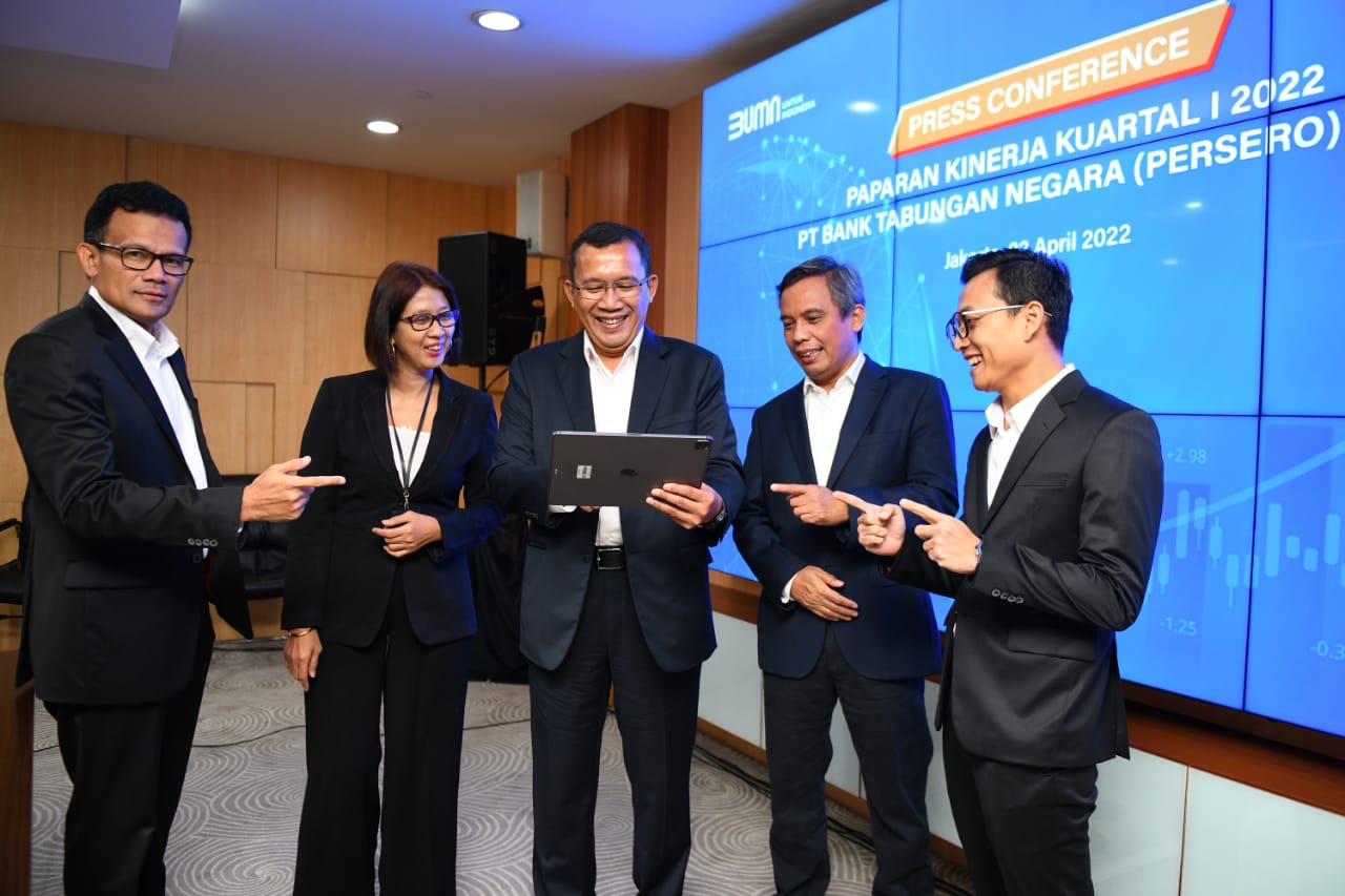Photo Credit : Direktur Utama Bank BTN Haru Koesmahargyo (tengah memengang Aplle) usai Paparan Kinerja Keuangan Bank BTN Kuartal I/2022 di Jakarta, Jumat (22/4)/Doc/ist