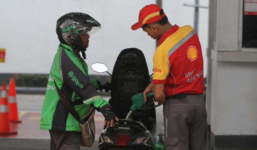 Pengendara motor melakukan pengisian BBM Shell jenis Super di SPBU Shell di jalan Menteng Raya, Jakarta. Sinpo/Agus Priatna