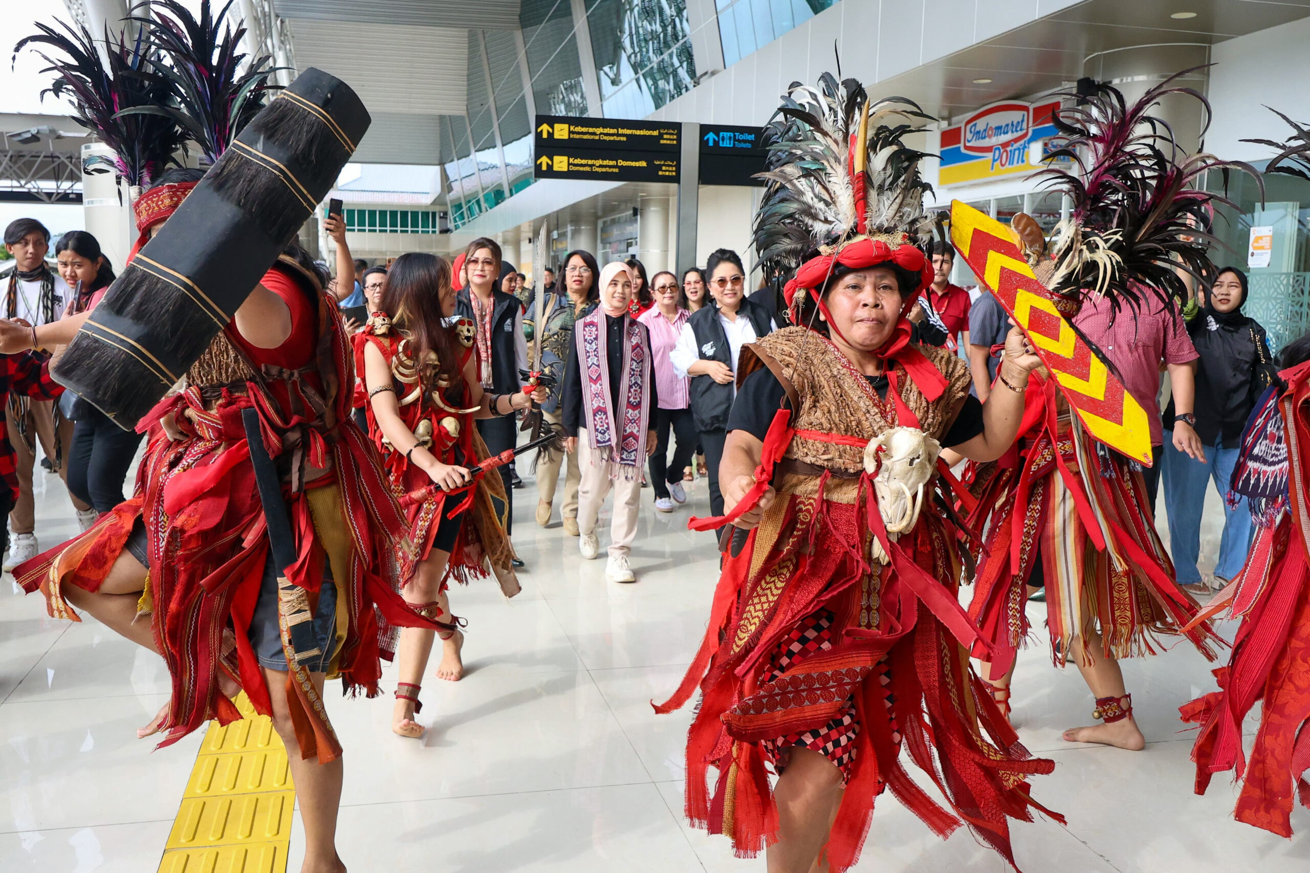Istri calon Presiden RI Ganjar Pranowo itu disambut meriah ratusan warga dan simpatisan yang telah menunggunya di luar bandara. Tampak sejumlah penari lengkap dengan pedangnya menyambut Atikoh.